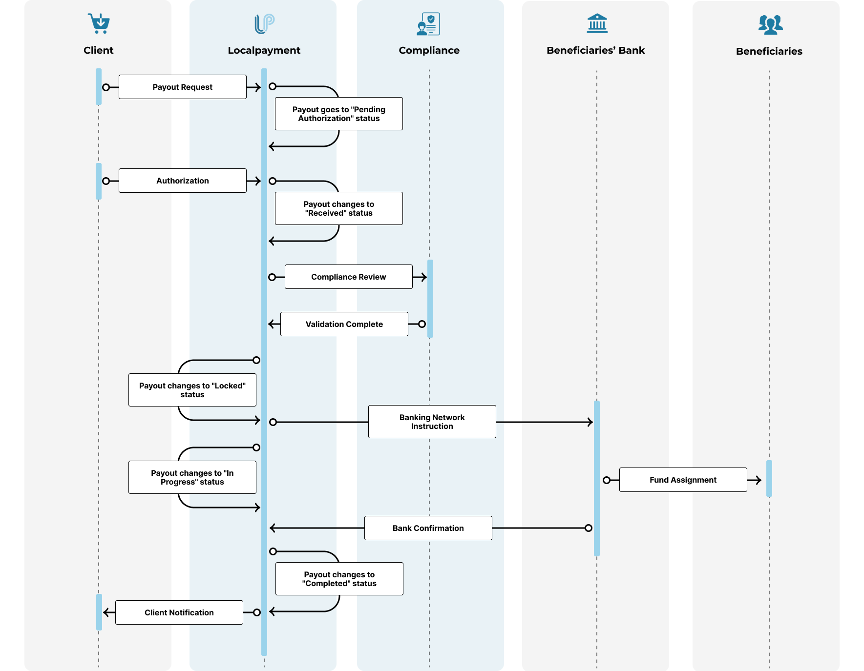 - Payout changes to "Received" status: Localpayment confirms receipt of the authorized payout request.