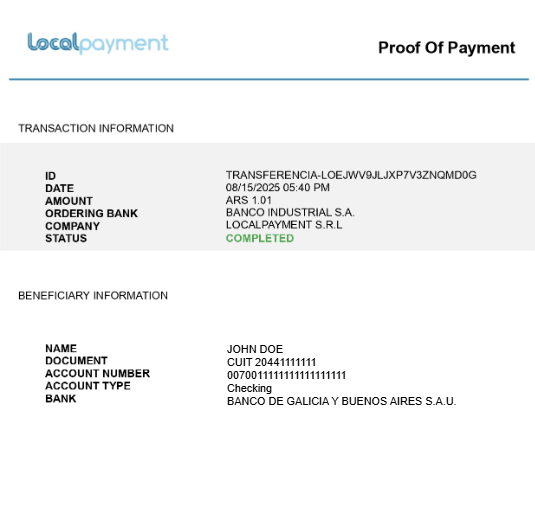 Access and download your official Proof of Payment vouchers directly from the Localpayment Dashboard. Your confirmation for completed payin refund transactions.