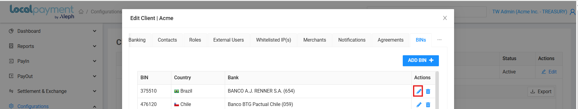 - Click the Edit option for the specific client you want to configure BIN whitelisting for.