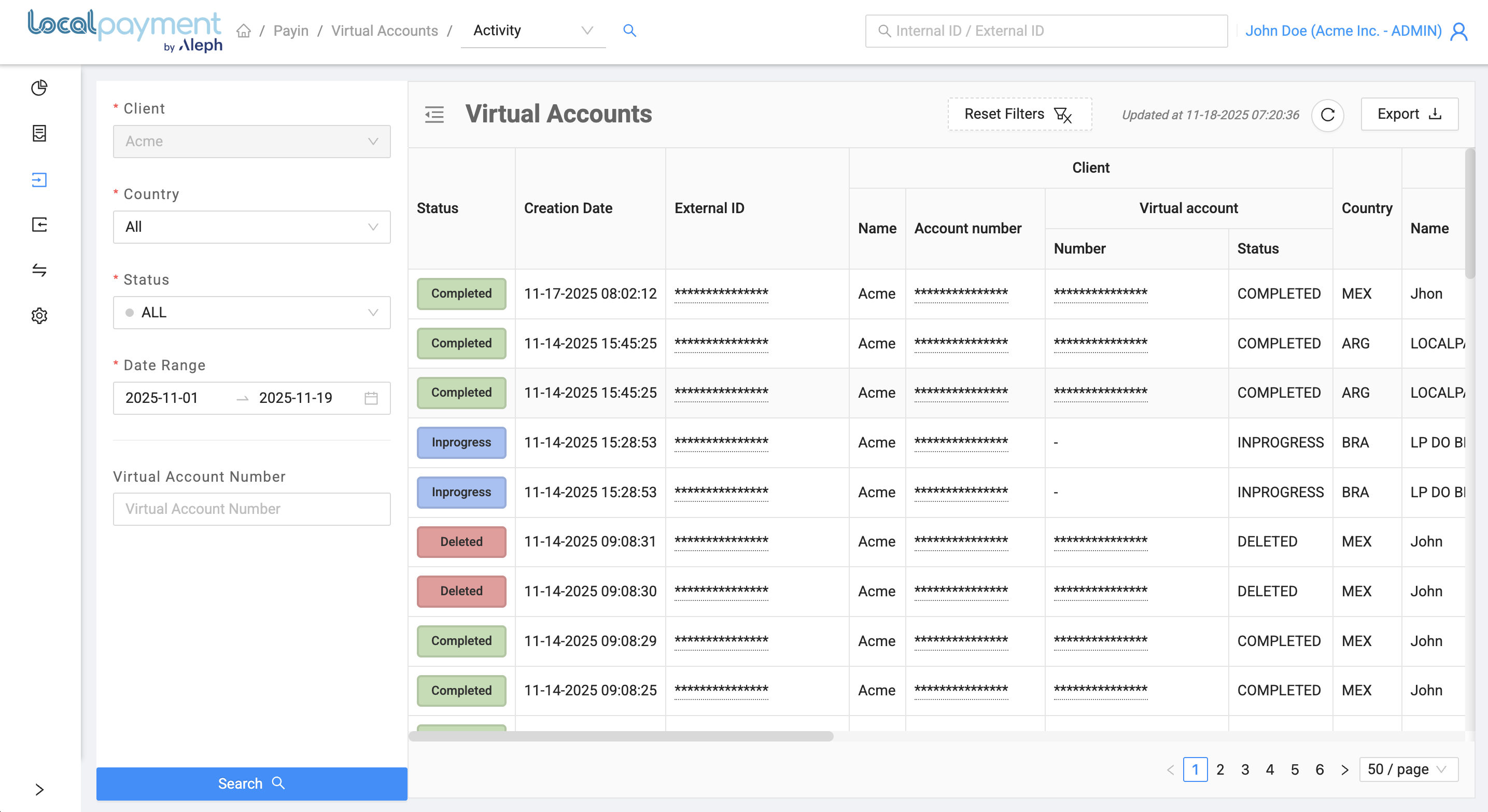 Localpayment provides multiple methods to monitor and retrieve the current status of virtual accounts, including individual account checks, batch processing status, and dashboard visualization. This guide outlines the different approaches for tracking virtual account status and managing account lifecycle.