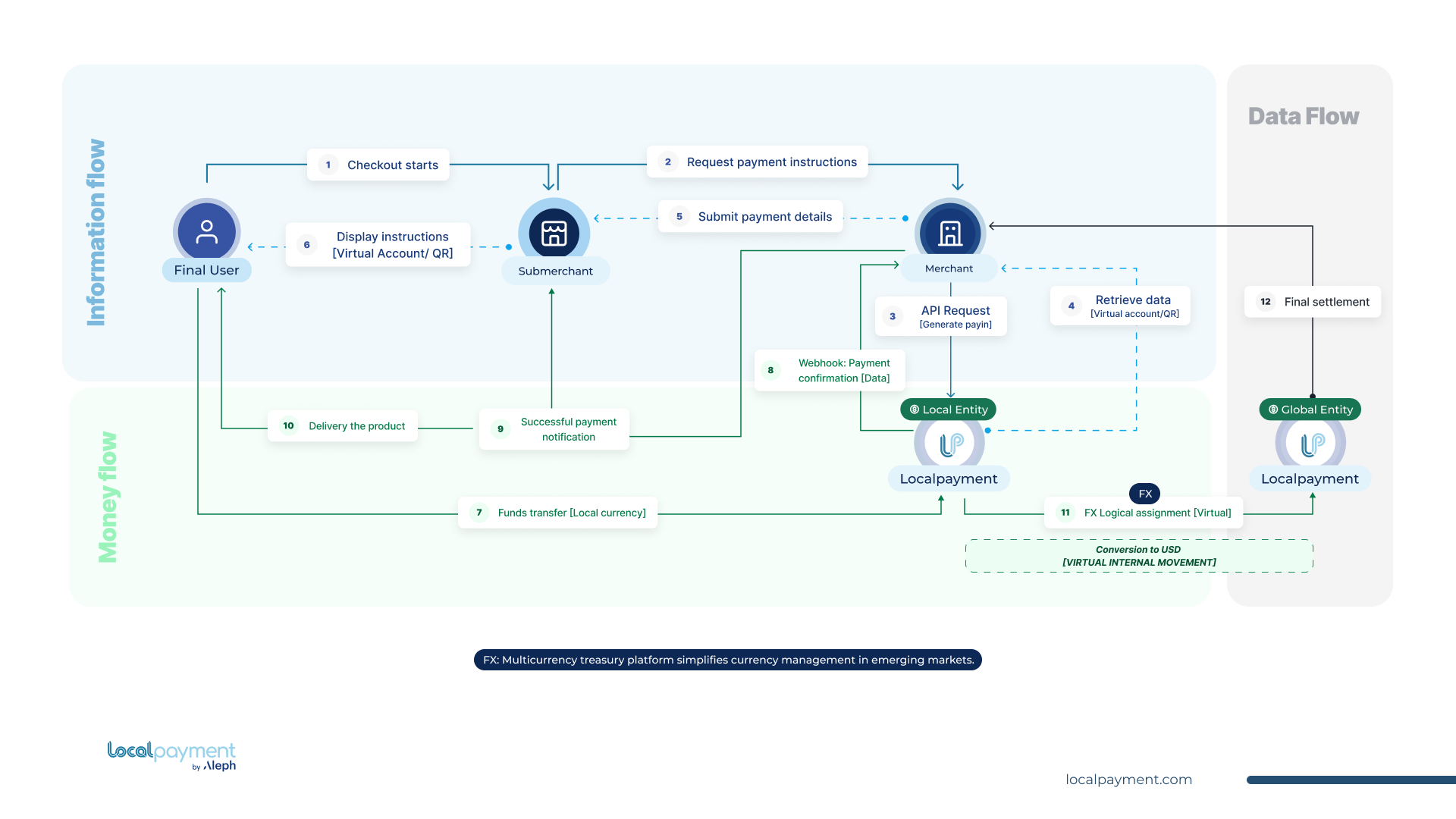 - Final settlement: The funds are converted and credited to your Internal Localpayment Account. They are now ready for payouts, internal transfers, or treasury management.