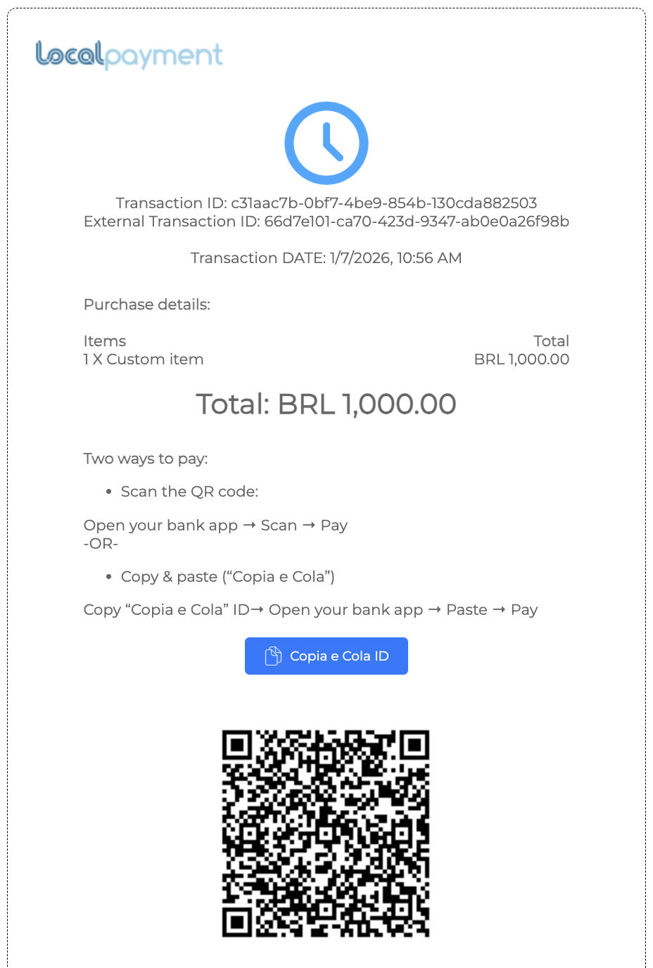 "paymentInstructions": "<div><b>Two ways to pay:</b></div><div><ul><li>Scan the QR code:</li></ul></div><div>Open your bank app → Scan → Pay</div><div>-OR-</div><div><ul><li>Copy & paste (“Copia e Cola”)</li></ul></div><div>Copy “Copia e Cola” ID→ Open your bank app → Paste → Pay</div>",