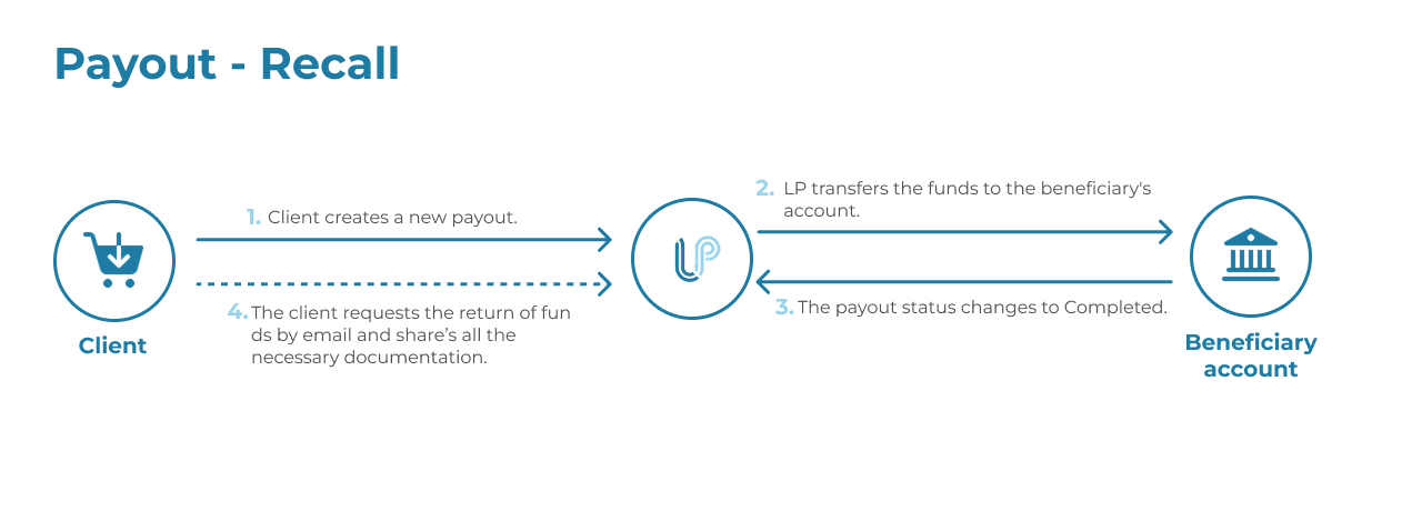 A Recall is a manual process used to recover funds when incorrect beneficiary wire information was provided during payout creation. Unlike returns, recalls require clients intervention and are not guaranteed to succeed.