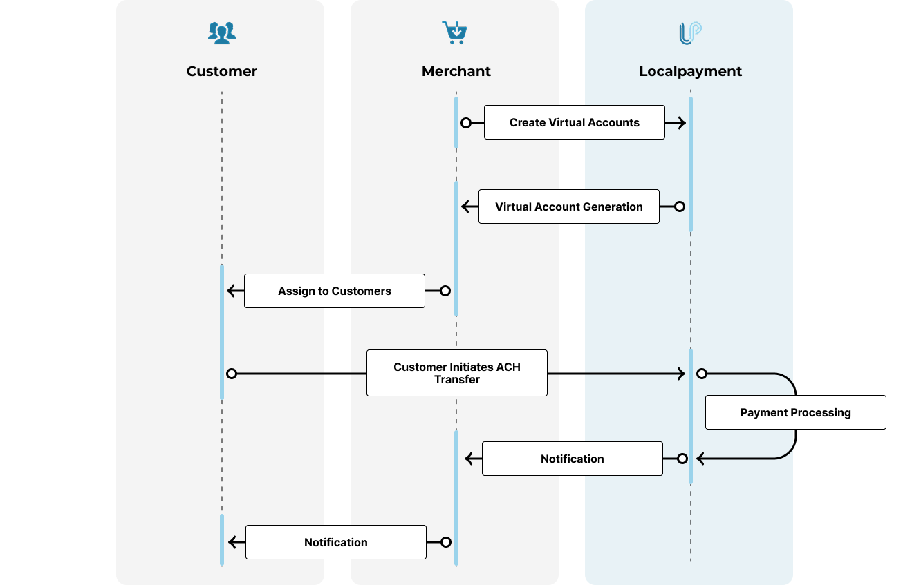 - Customer Initiates ACH Transfer: Customers perform local ACH bank transfers, directing funds to their assigned virtual account numbers. This method ensures that payments are routed correctly without the need for additional identifiers.